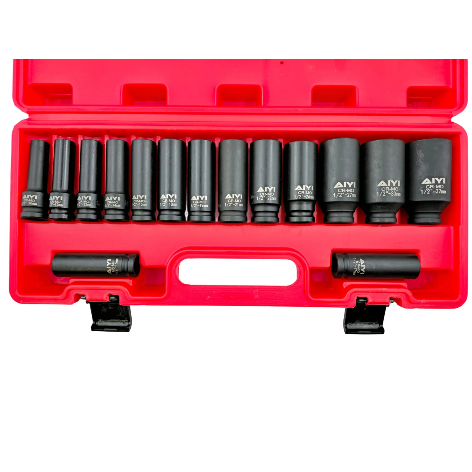 The AIYI 18-Piece 1/2-Inch Sleeve Adapter and Impact Socket Set is built for professionals and DIY enthusiasts who need high-quality, reliable tools for heavy-duty tasks. Constructed from premium chrome molybdenum (Cr-Mo) steel, this set delivers exceptional durability and strength, capable of withstanding high torque from pneumatic and manual impact wrenches.
