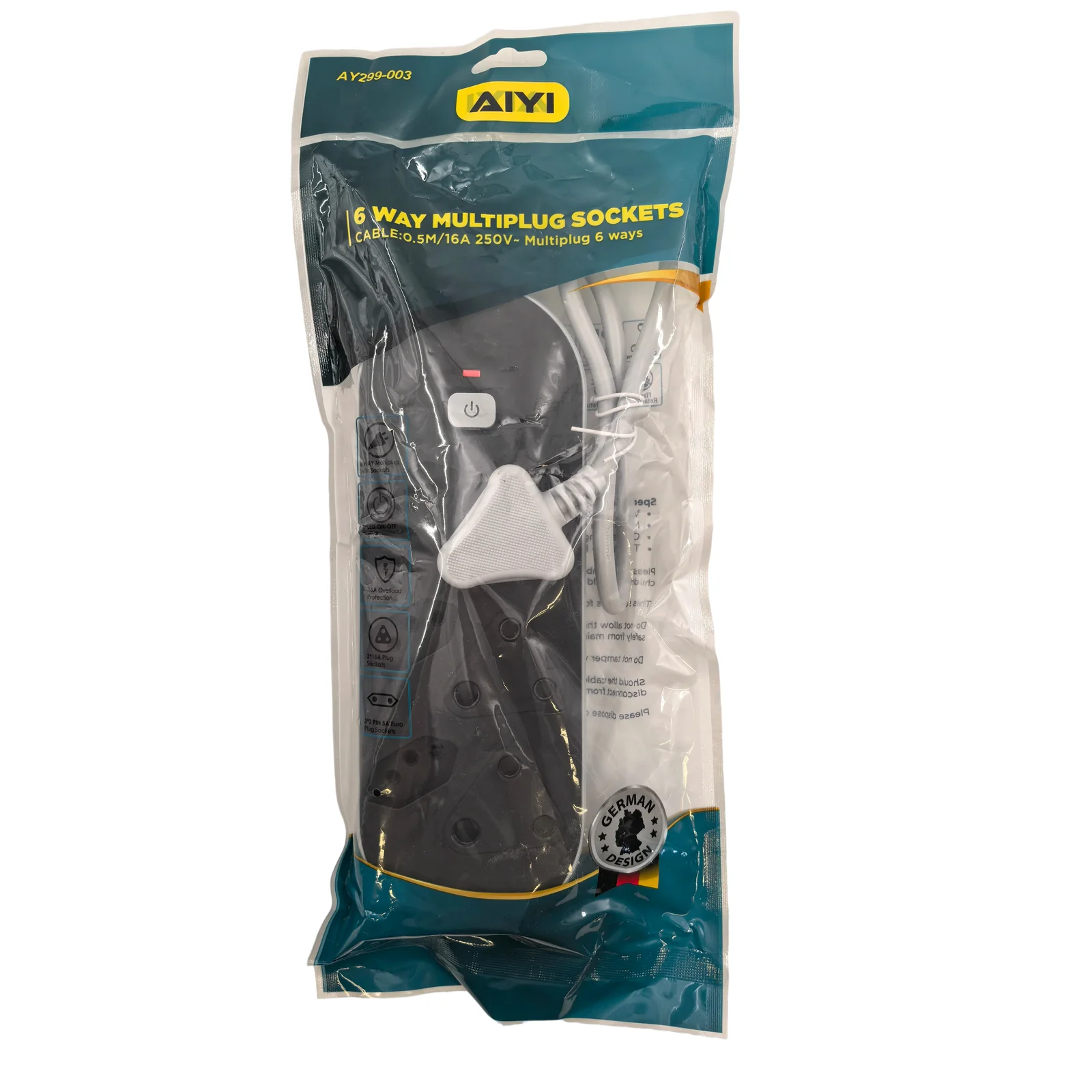 This 6-Way Multi-Plug Adaptor is designed for modern South African households and offices, featuring a mix of 3 × traditional SA 3-pin outlets (Type M, large round pin) and 3 × new standard SA 3-pin outlets (SANS 164-2, compact round pin). This combination makes it ideal for powering both older appliances and newer devices that use the updated plug design.