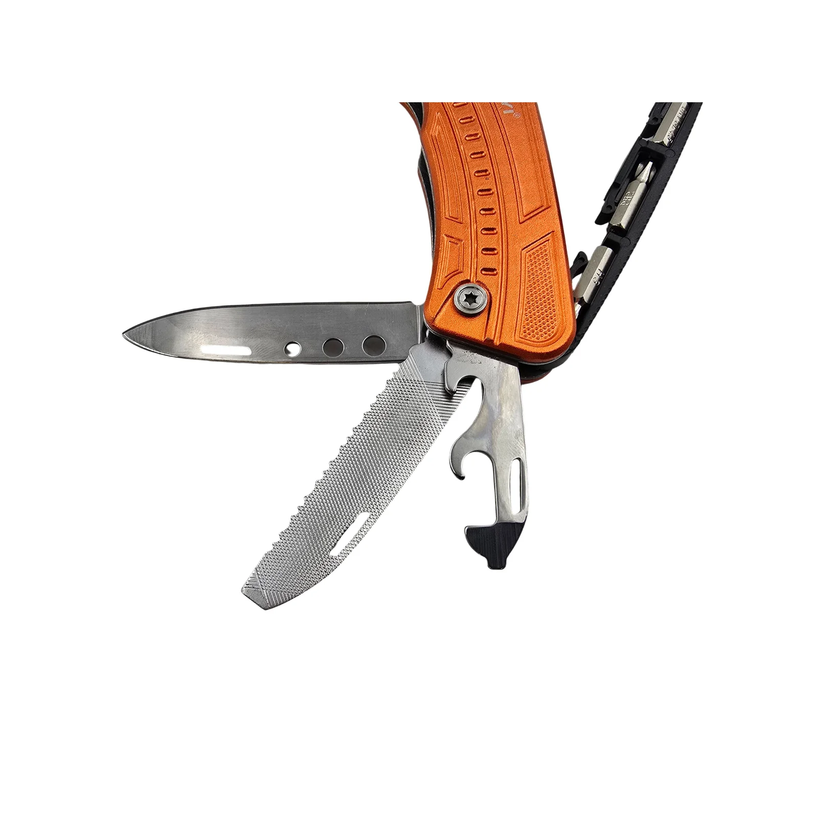 It includes an adjustable wrench for gripping and turning nuts and bolts, plus three interchangeable screwdriver bits (Phillips, flat, and Allen) that fit securely into the integrated bit holder at the top of the wrench head for comfortable and precise use. Additional fold-out tools – including a knife, saw blade, file, bottle opener, and can opener – make it ready for almost any task.