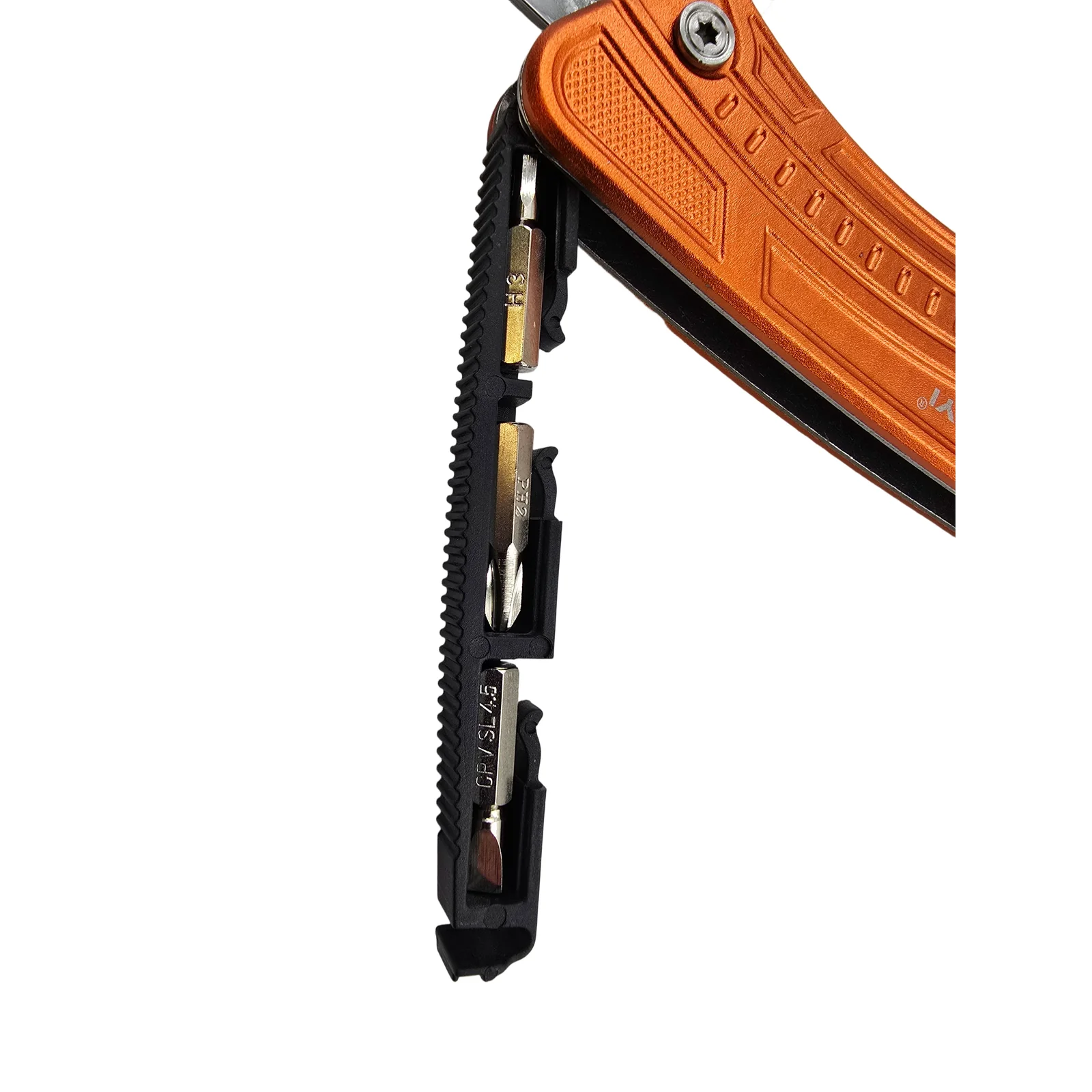 Integrated bit holder in wrench head – holds screw bits securely for easy use.