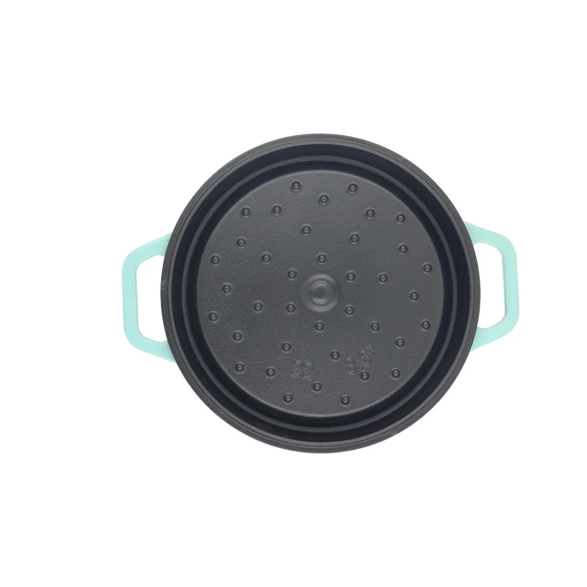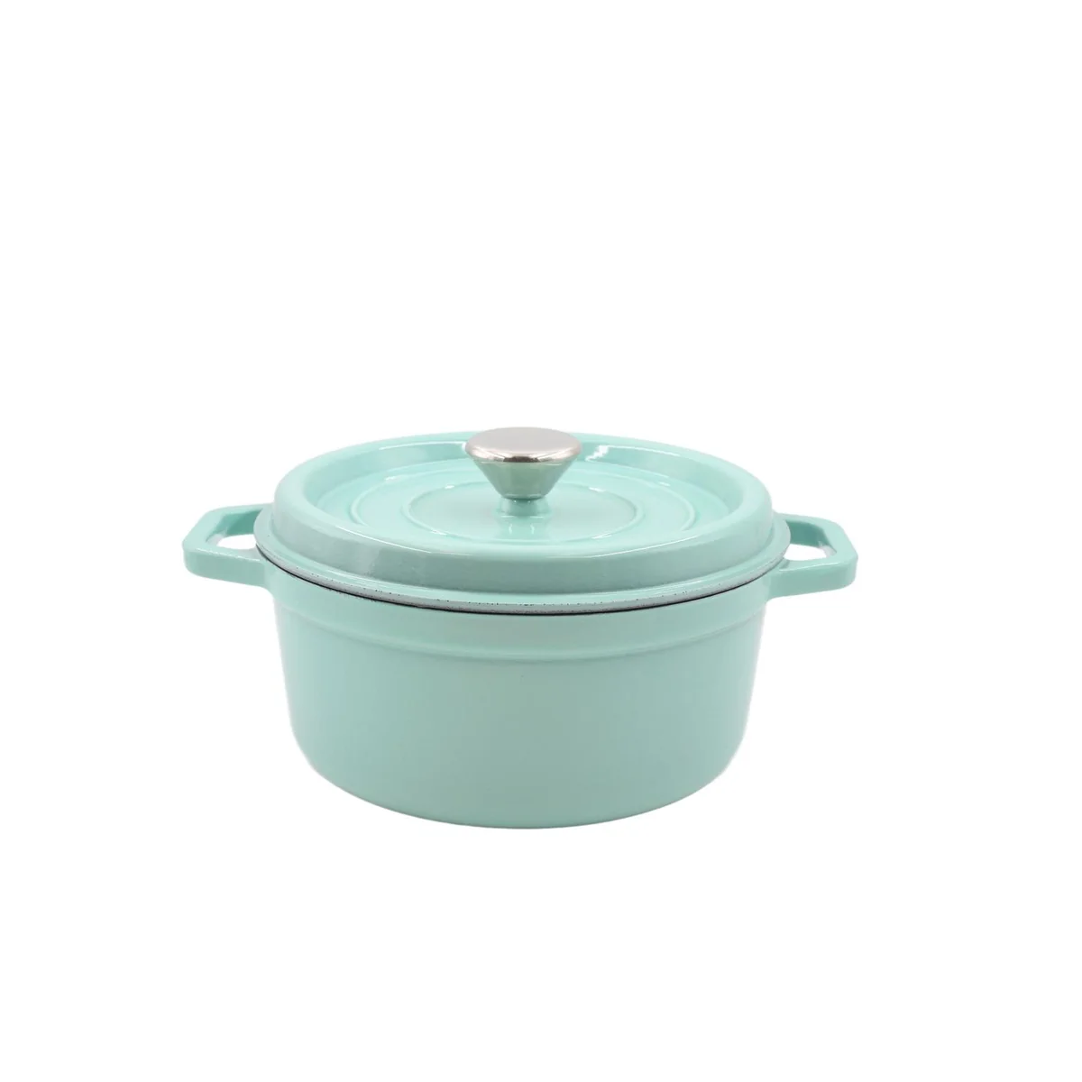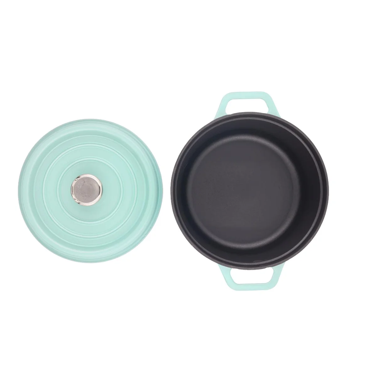Cook in style with this 22cm Cast Iron Enamel-Coated Dutch Oven in a refreshing aqua hue. Made from durable cast iron with a glossy enamel finish, this Dutch oven ensures excellent heat distribution and retention, making it perfect for slow-cooked meals, stews, soups, and even baking bread. The enamel coating prevents the need for seasoning, while the stainless steel knob and dual handles make it easy to move from stovetop to oven to table. A vibrant and practical addition to your kitchen cookware.
