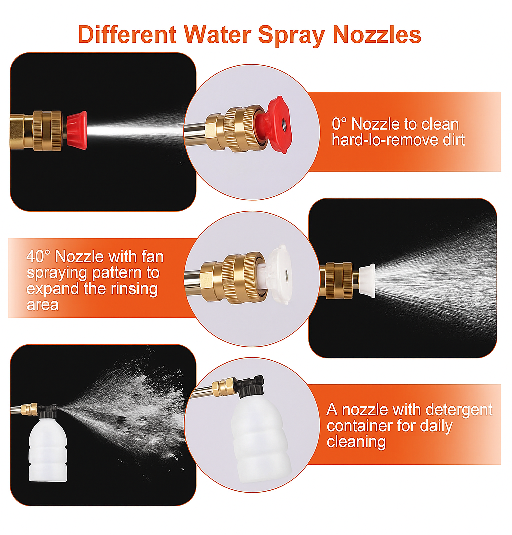 Multiple spray nozzles (jet, fan spray, wide-angle) for all cleaning tasks