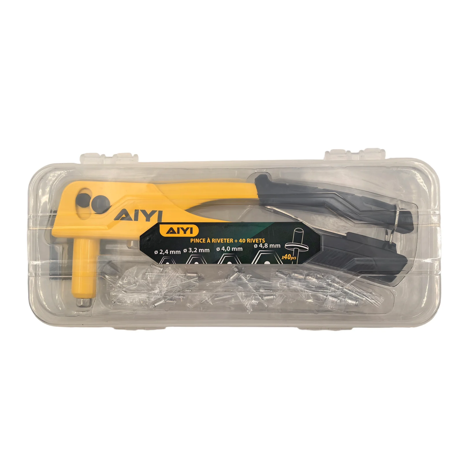 This tool is equipped with four interchangeable nosepieces to accommodate multiple rivet sizes. For convenience, it comes with a set of 40 rivets (10 pieces of each size: 2.4mm, 3.2mm, 4.0mm, and 4.8mm), making it ready for use right out of the box.