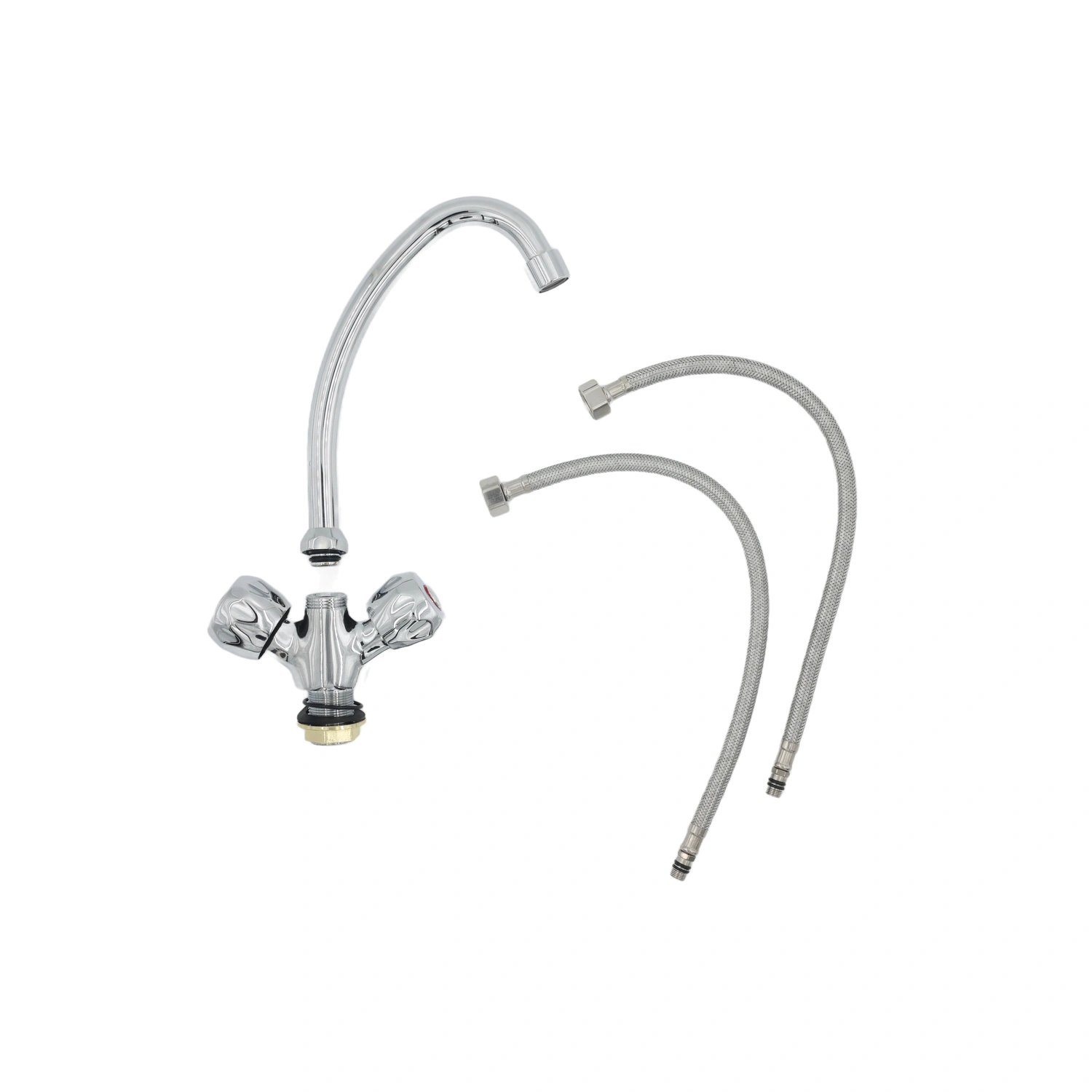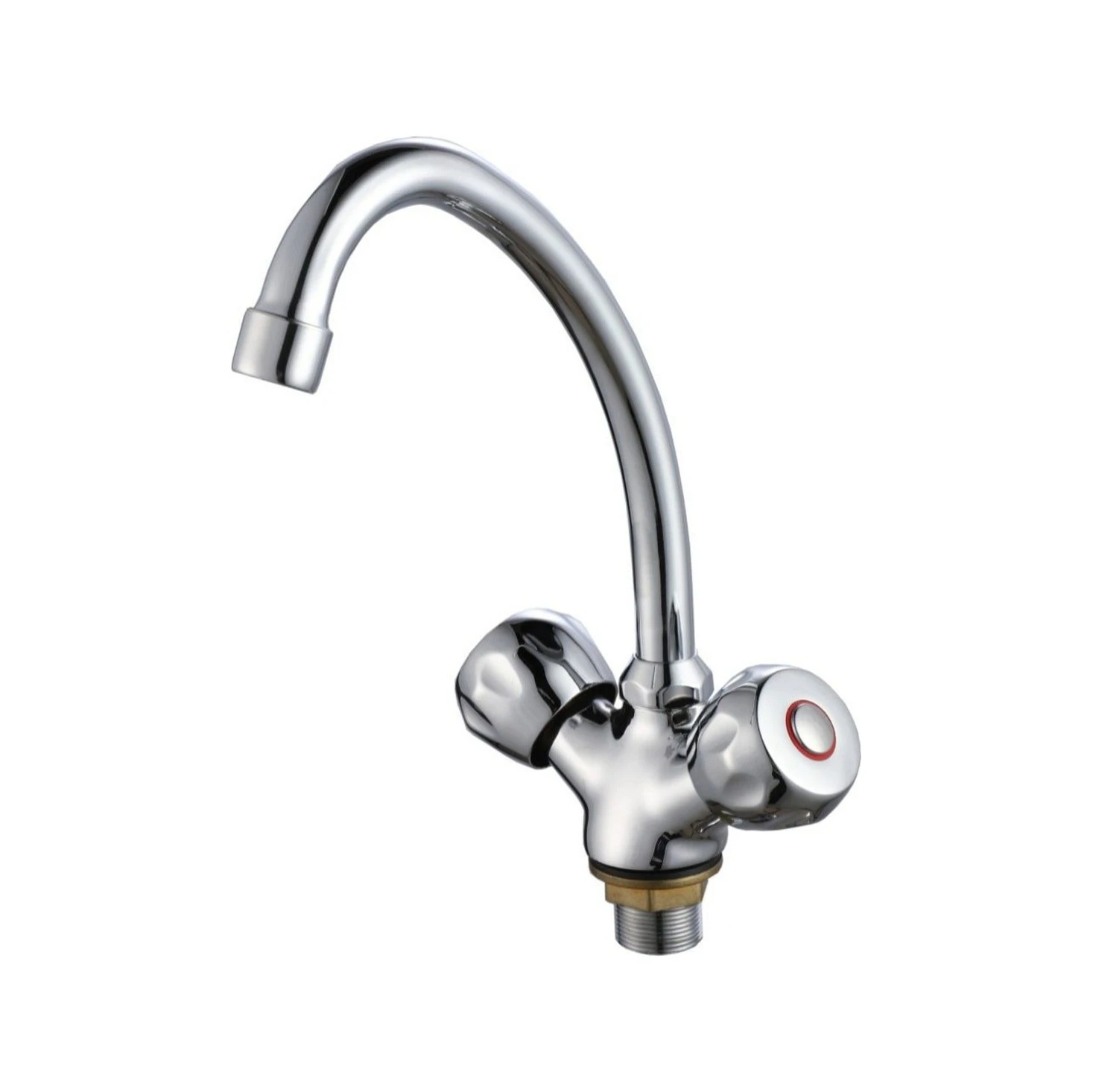 This high-arc kitchen tap features a tall, curved spout that provides ample space for rinsing large pots and washing dishes with ease. The dual cross handles allow independent control of hot and cold water, offering a more traditional feel. Finished in polished chrome, it adds a modern touch to any kitchen while offering long-lasting durability and corrosion resistance. Ideal for everyday family use.