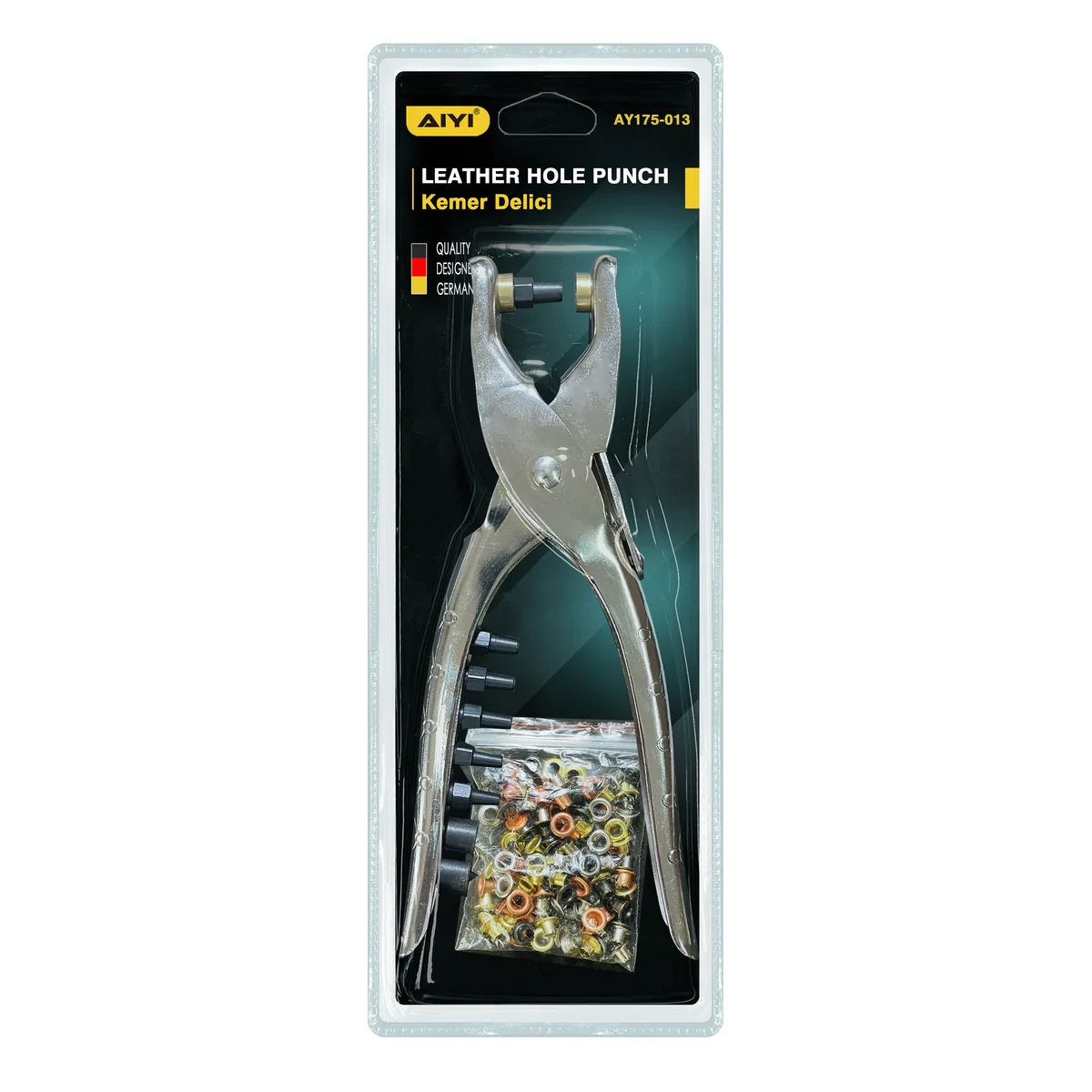 The AIYI Leather Hole Punch (AY175-013) is a versatile and durable tool designed for creating clean, precise holes in leather, belts, canvas, and other materials. Its heavy-duty metal construction ensures long-lasting performance, while the ergonomic handle provides a comfortable grip for effortless punching. The tool includes a range of interchangeable punch tips, making it suitable for various hole sizes to meet your project needs.