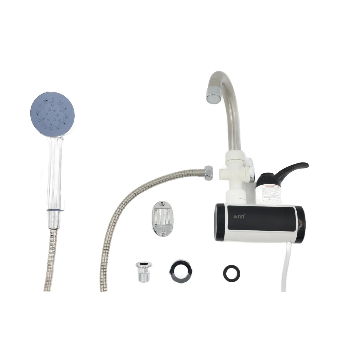 This instant electric heating tap provides hot water in just 3 to 5 seconds, perfect for kitchens without a geyser. It features a visible digital temperature display and two spout options – a fixed curved spout and a flexible hose – offering added convenience for rinsing, filling, or cleaning. No preheating is needed. Water and electricity are kept separate for absolute safety, with built-in anti-leakage protection and an automatic power cut-off when water flow stops. With 3000W of rated power, the water temperature is adjustable between 30°C and 60°C