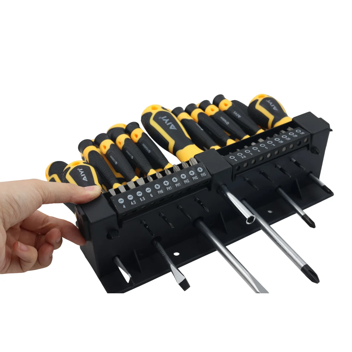 This 37-piece screwdriver and bit set offers a complete solution for your repair and DIY needs. With a variety of screwdrivers and interchangeable bits, it’s ideal for home, garage, or workshop use. The ergonomic handles provide a secure, comfortable grip, while the sturdy wall-mountable rack keeps tools organized and accessible.